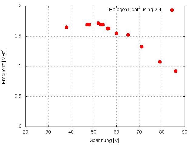 Die Tatsache, dass Schwingungen entstehen, ist an sich nicht überraschend. Es ist wie bei einer Glimmlampe, die an einem sich aufladenden Kondensator hängt und periodisch zündet. Überraschend ist hier die hohe Frequenz. Ich konnte mit der Halogenbirne bis zu 1,7 MHz erzeugen. Das war bei niedriger Brennspannung unter 50 V der Fall. Höhere Spannungen ergaben niedrigere Frequenzen. Bei 85 V sind es nur noch 900 kHz. |