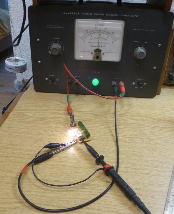 Der Glaskolben der Birne ist mit einem Halogengas von ganz geringem Druck gefüllt. Da sollte es doch möglich sein, wie bei einer Glimmlampe eine Gasentladung zwischen den beiden Fadenhälfte zu zünden, nicht wahr? Dazu braucht es freilich eine höhere Spannung als die 12 Volt, für die diese Birne eigentlich gemacht worden ist. Zu diesem Zweck schließe ich sie an mein Heathkit-PS3-Labornetzgerät an, das bis zu 500 V Gleichspannung liefern kann.