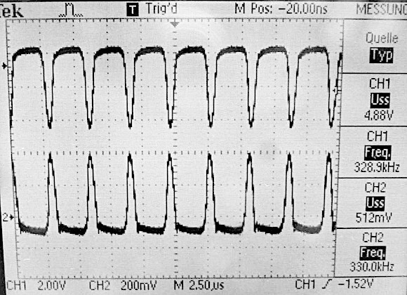 Mit dem Oszilloskop kann man erkennen, dass dem Lampenstrom ein impulsförmiger Hochfrequenzstrom überlagert ist. Die Zeitbasis ist auf 2,5 µs pro Teilung eingestelt. Die obere Kurve zeigt den Spannungsverlauf: Impulse von 0,5 µs Länge, dann 2 µs Ruhe. Die Amplitude der Impulse liegt bei knapp 5 V. Die Frequenz ist 330 kHz. Sie hängt von der Spannung ab. Die untere Kurve zeigt den Stromverlauf. Die Impulsspitzen lagen um etwa 0,5 mA über dem Grundstrom. |