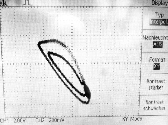 Reguläre Schwingungen Dieses Oszillogramm habe ich dann im xy-Modus aufgenommen. Es zeigt den momentanten Strom I(t) als Funktion der momentanen Spannung U(t). Wenn wir dieses Oszillogramm mit dem von oben vergleichen, das U(t) und I(t) auf der linearen Zeitachse darstellt, dann müssen wir beachten, dass die ovale Schleife die kurzen Impulse repräsentiert, also gegenüber dem inaktiven Rest der Schwingungsperiode zeitlich gedehnt ist. Die ovale Gestalt des Graphen zeigt an, dass der Stromimpuls gegenüber dem Spannungsimpuls etwas vorausläuft.