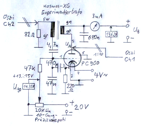 Die Schaltung unterscheidet sich praktisch nicht von derjenigen ganz oben. Der Arbeitspunkt wird mittels eines Präzisionspotis auf 10 mV genau über die positive Gittervorspannung Ug0 eingestellt. Die Betriebsspanung von hier 136.2 V wurde mittels Digitalmultimeter auf das zehntel Volt genau konstant gehalten. Um Klystron-Oszillationen mit Frequenzen im UKW-Bereich zu unterdrücken, die bei solchen sehr steilen Trioden gern entstehen, musste ich über ganz kurze Anschlussdrähte einen HF-tauglichen 470-pF-Kondensator direkt zwischen Gitter und Kathode schalten.