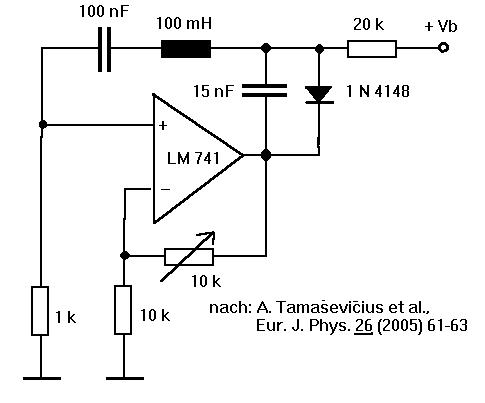 Natürlich lassen sich chaotische Phänomene auch mit Halbleiter-Oszillatoren demonstrieren. Ein schönes, leicht nachzubauendes Beispiel zeigt die Schaltung links im Bild, die eine litauische Forschergruppe vor einigen Jahren in einer Zeitschrift vorgestellt und genau dokumentiert hat. |