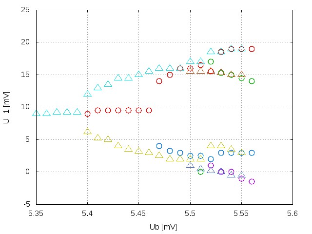 Die Abfolge der Periodenverdopplungen Mit dieser Schaltung konnte ich eine Folge von vier Periodenverdopplungen herbeiführen. Rekord! Der chaotische Übergang lag als Funktion der Gittervorspannung Ug0 bei Ukr = 13.48 V. Die Verdopplungen traten bei Spannungen auf, die um 1.01, 0.46, 0.20 und 0.06 V darüber lagen.