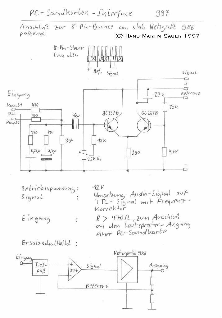 Das "Party-Modul": die Spannung kann man auch über den Line-Ausgang der Soundkarte eines PCs steuern. Es ist ein einfacher Differenzverstärker mit zwei Si-Transistoren. Die Stereokanäle des Soundkartenausgangs werden zusammengeführt. Die RC-Glieder am Eingang schwächen hohe Frequenzen jenseits 2 kHz. Das Modul ermöglicht es, die Gleichspannung, die das Netzgerät normalerweise liefert, mit beliebigen Wechselspannungen zu modulieren. |