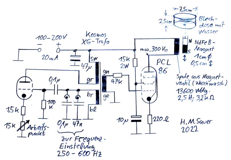 Ich habe die Dose nun waagerecht montiert und die Spule aus dem Magnetventil einer alten Waschmaschine eingebaut. Diese kann mehr Kraft erzeugen als die Spule aus dem Schaltschütz und hat weniger Induktivität. Dafür aber kann mehr Strom hindurchfließen. Eben dazu braucht es hier eine Leistungspentode. Und die PCL 86 dürfte hier genau das Richtige sein. Auf den Magneten am Boden der Blechdose läßt sich jedenfall eine bedeutende mechanische Energie in Form von Schwingungen übertragen. Die Auf-und-Ab-Schwingungen des Dosenbodens übertragen sich auf die Wasseroberfläche, die ja leicht beweglich ist.